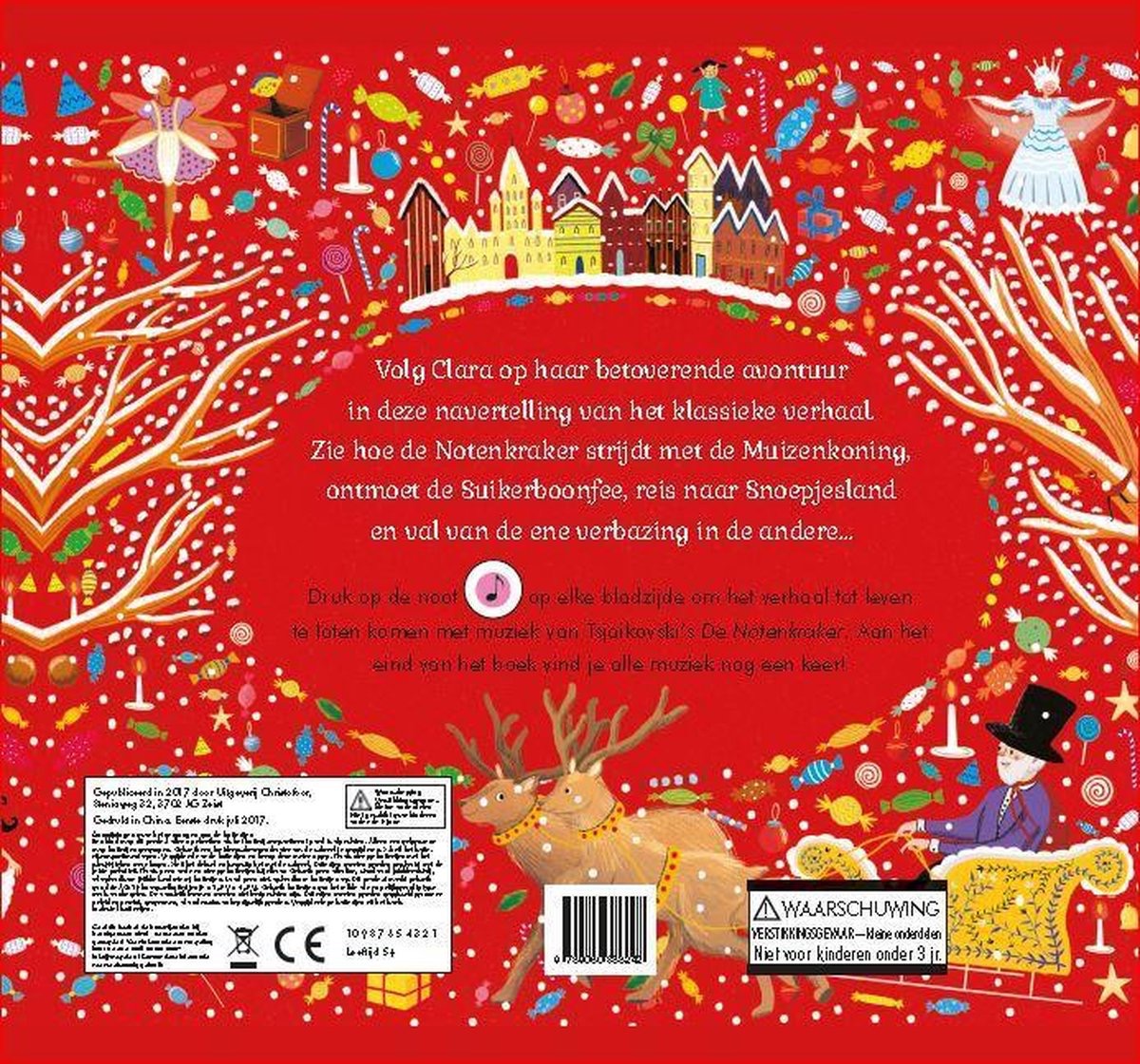 Volg Clara in een betoverend Kerstavontuur in deze vertelling van het klassieke balletverhaal De notenkraker. Ga je mee? Dan zie je hoe de Notenkraker met de Muizenkoning strijdt, ontmoet je de Suikerfee en reis je naar Snoepjesland, waar van alles te beleven valt. Bovendien zit er muziek in dit boek. Op elke bladzijde kun je op een noot drukken, waardoor het verhaal tot leven komt met de muziek van Tsjaikovski's De Notenkraker. Je kunt zelfs een dansje maken!