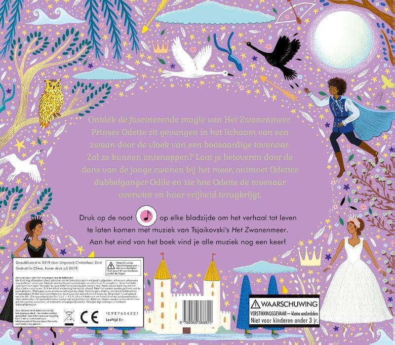 Prinses Odette zit gevangen in het lichaam van een zwaan door de vloek van een boosaardige tovenaar. Zal ze kunnen ontsnappen? Laat je betoveren door de dans van de jonge zwanen bij het meer, ontmoet Odettes dubbelganger Odile en zie hoe Odette de tovenaar overwint en haar vrijheid terugkrijgt. Druk op de noot op elke bladzijde om het verhaal tot leven te laten komen met muziek van Tsjaikovski's Het Zwanenmeer: Net als bij de andere boeken uit deze succesvolle reeks hoor je de bekende klanken van een echt orkest! Aan het eind van het boek vind je extra informatie over klassieke muziek én alle muziek nog een keer!