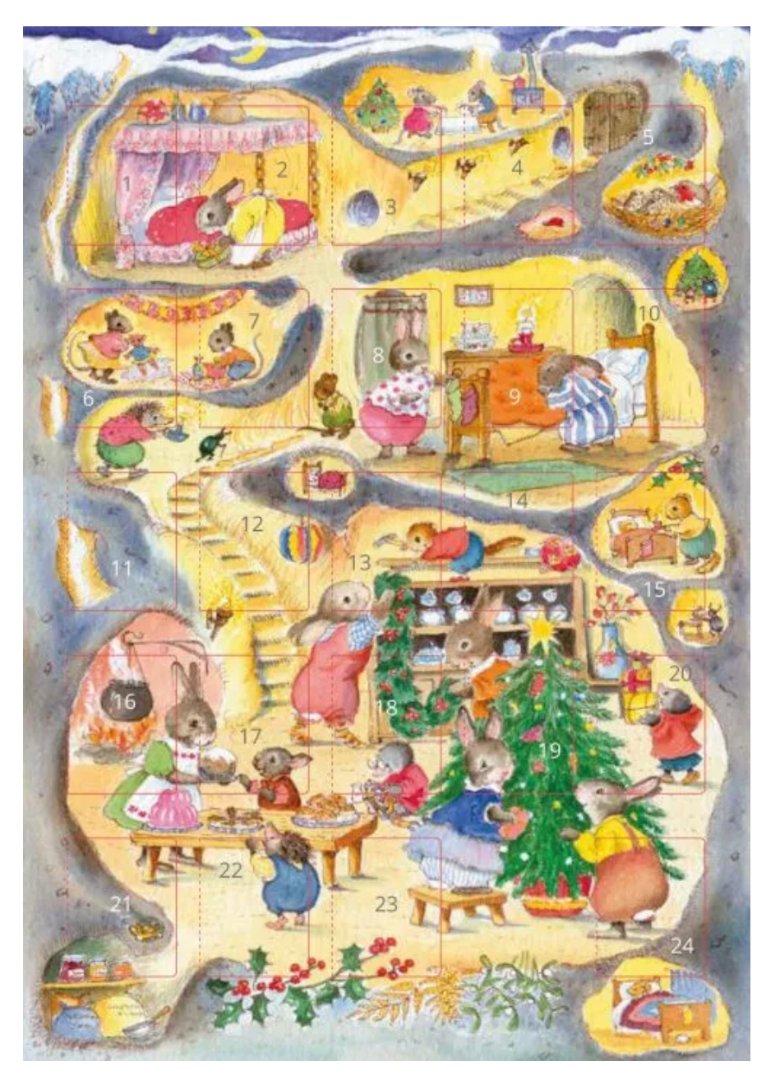 Prachtige sprookjesachtige kaart met 24 vakjes om te openen, met de liefste afbeeldingen erachter. De kaart kan opengevouwen worden en een envelop is inbegrepen. Leuk om te verzenden, maar ook mooi om thuis neer te zetten.