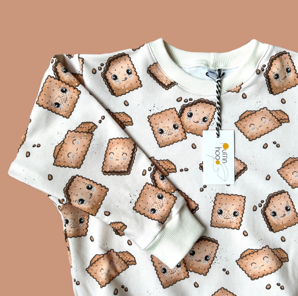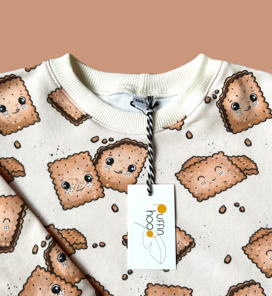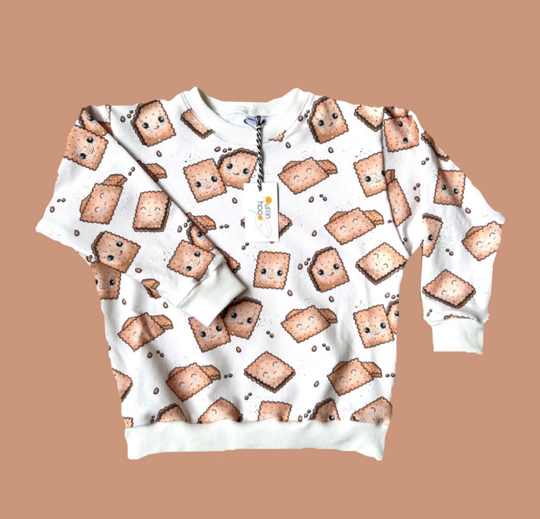 Om van te smullen! ;) Deze zachte sweater met vrolijke cookies print. De stof is french terry, dit is dikker dan tricot/jersey, maar dunner dan jogging/sweat stof, het hele jaar door te dragen.