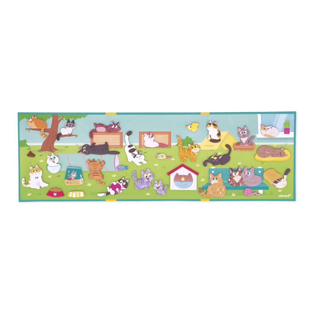 Laat je fantasie de vrije loop met deze vrolijke kattenbende! Elke kat heeft zijn eigen favoriete plekje: op een tak, in een mand of goed verstopt. Met het grote magnetische decor en de 30 magneten kan je kind eindeloos nieuwe verhalen bedenken door de katten telkens opnieuw te verplaatsen. Het handige, draagbare formaat maakt het spel ideaal om overal mee naartoe te nemen en steeds opnieuw te spelen. Dit creatieve spel stimuleert de verbeelding, creativiteit en fijne motoriek. Gemaakt van FSC-karton en geschikt voor kinderen vanaf 3 jaar.
