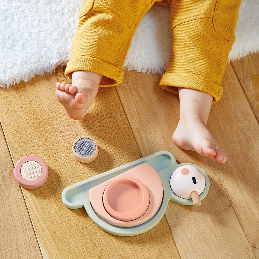 Het spiraalvormig slakkenhuis van deze slak verbergt heel wat verrassingen! Onder elke blok is er een andere textuur te vinden! Dit speelgoed bestaat uit een voetstuk en 6 stukken om te stapelen. 4 sensorische blokken (een blok met een spiegel en 3 silicone blokken met verschillend reliëf) en, niet te vergeten, het hoofd en het lichaam van de slak. Dit speelgoed is ideaal om de tastzin en de fijne motoriek bij uw kind te ontwikkelen. Educatief speelgoed van FSCTM-hout voor kinderen vanaf 12 maanden.