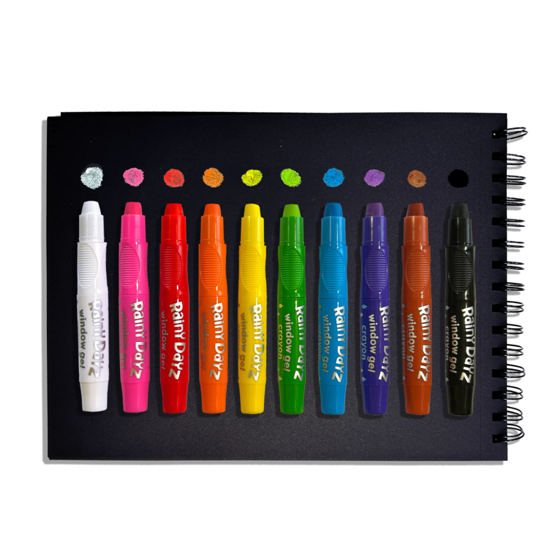 Maak het binnen gezellig als het buiten regent! Uitstekend speelgoed voor een regenachtige dag. Set van 10 raamstiften. Schrijft op glas, spiegels en papier. Gemakkelijk te verwijderen met water. Uitwasbaar.