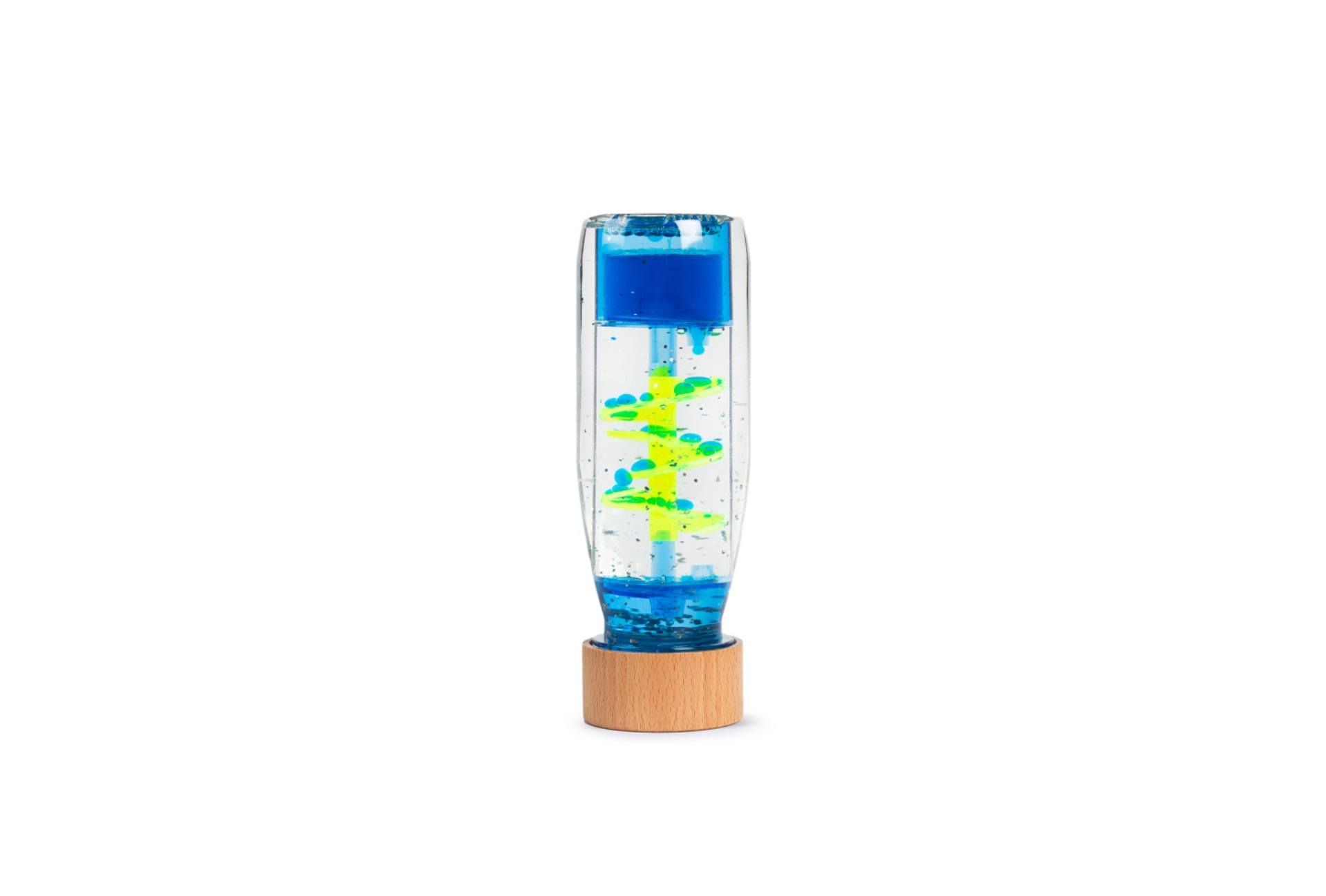 Nieuw in de Petit Boum serie, deze fles met vloeibare vulling, als je hem omdraait, druppelt de blauwe vloeistof in bolletjes in spiraalvorm naar beneden. De flessen van Petit Boum zijn heel veelzijdig, je kunt ermee schudden, rollen, eindeloos ontdekken. Het spelen met de flessen stimuleert de zintuigen, en werkt bovendien ontprikkelend.