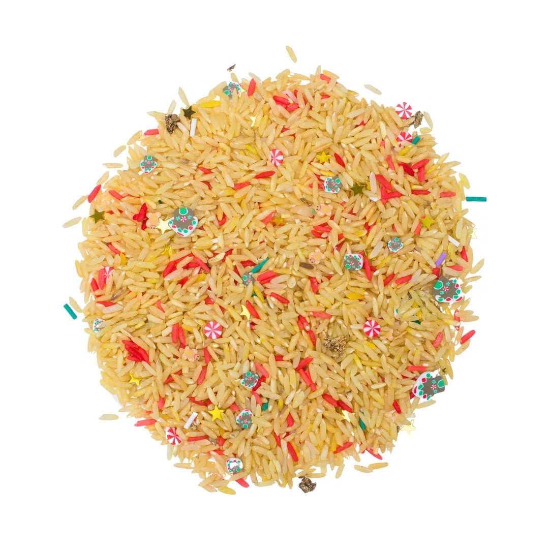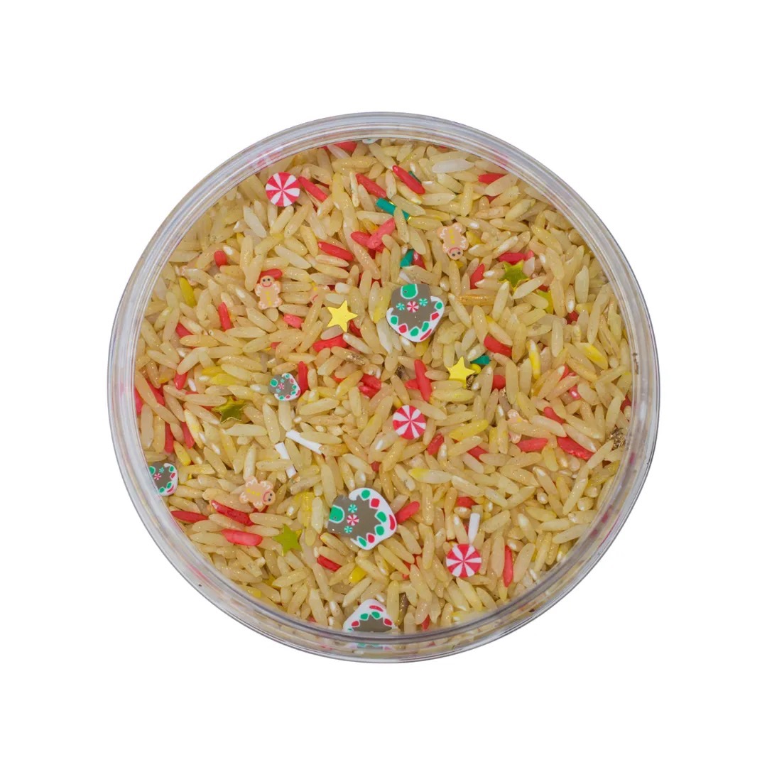 Maak de speelbak extra feestelijk met deze mix van goudgele rijst met gouden glitter en vrolijke kerstfiguurtjes zoals kersthuisjes, sterretjes, zuurstokjes en peperkoekmannetjes.