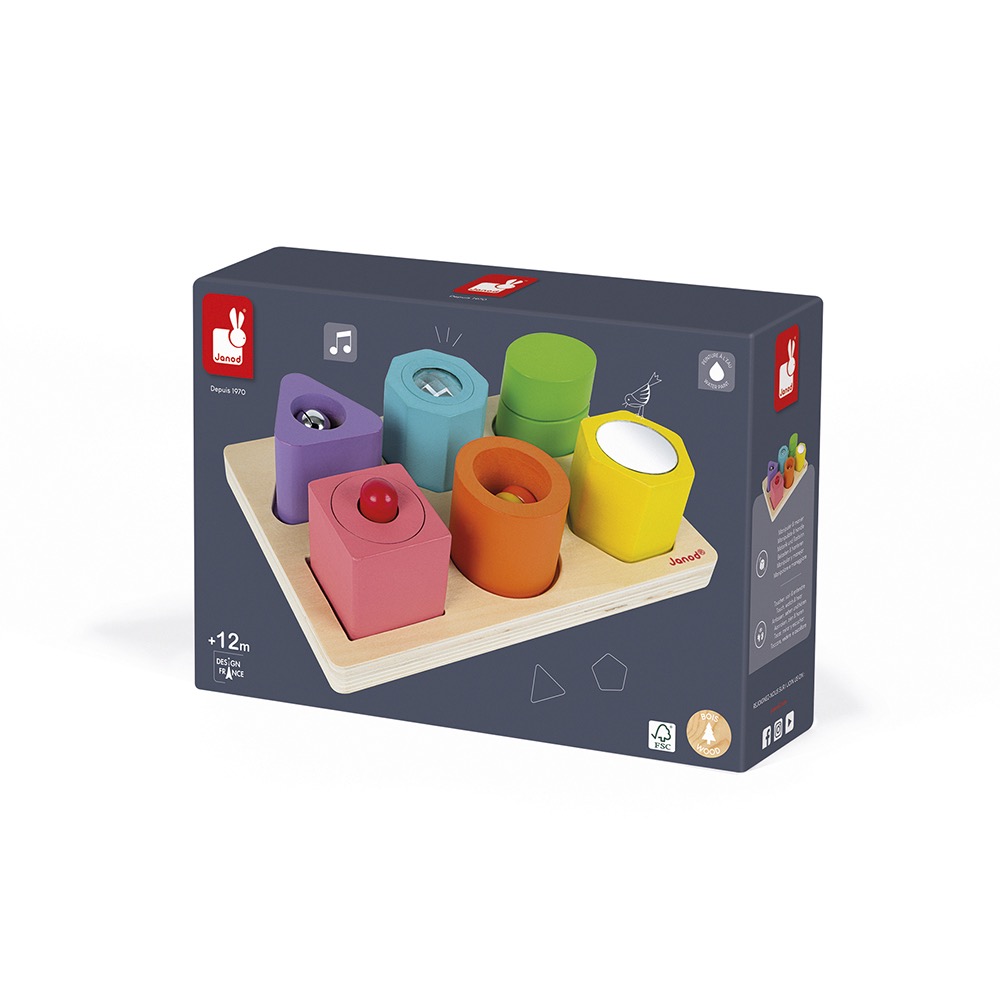 Een prachtige houten vormen puzzel die de zintuigen prikkelt. Deze sensorische puzzel is geschikt voor kindjes vanaf ongeveer 12 maanden. Leer kleuren en vormen ontdekken, ontdek alle leuke functies van de blokjes (bel, caleidoscoop, rammelaar, pieper, spiegel etc.) of stapel ze op elkaar om er een toren van te maken. Mooi open einde speelgoed, voor vele uren speelplezier.